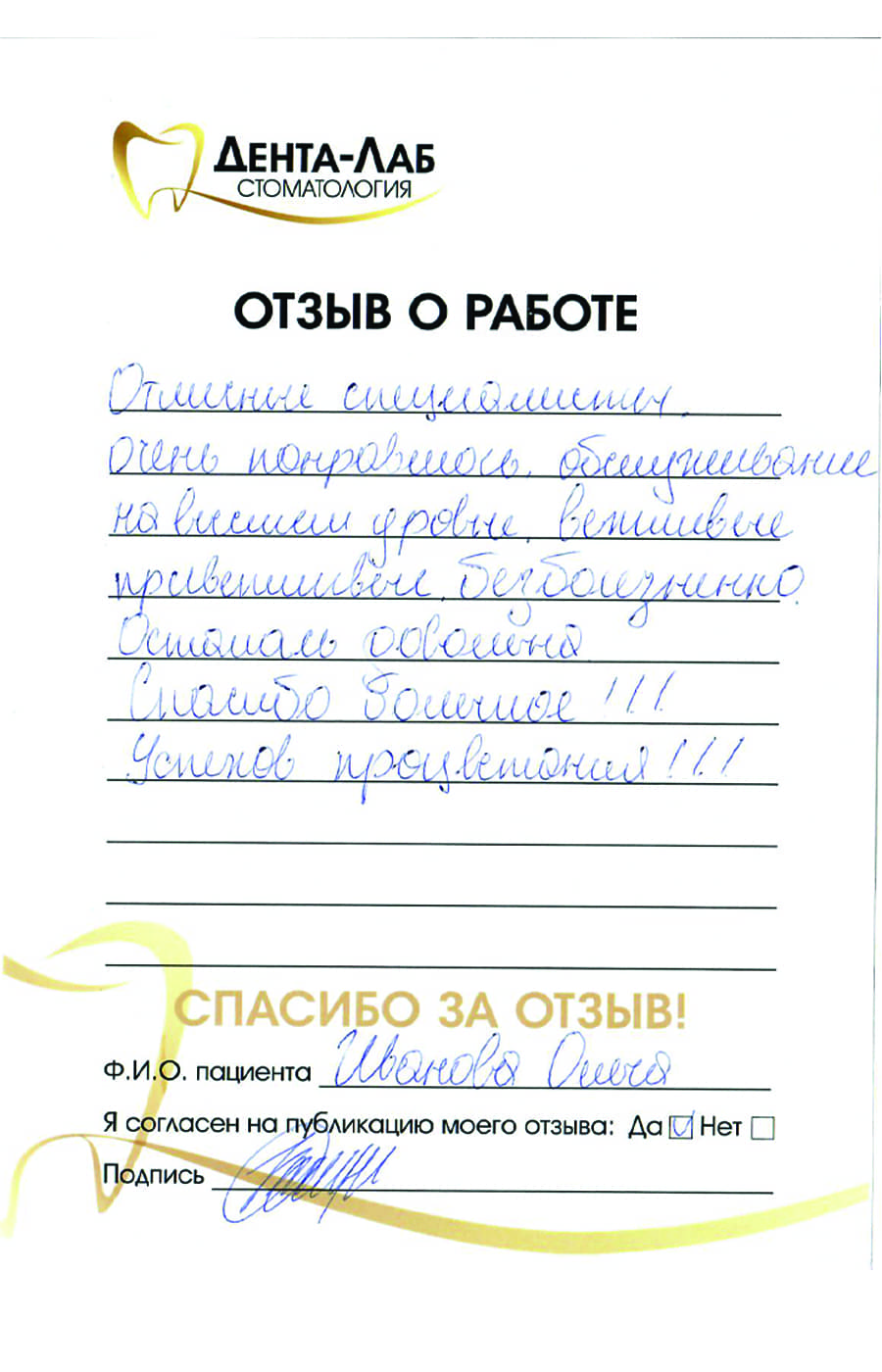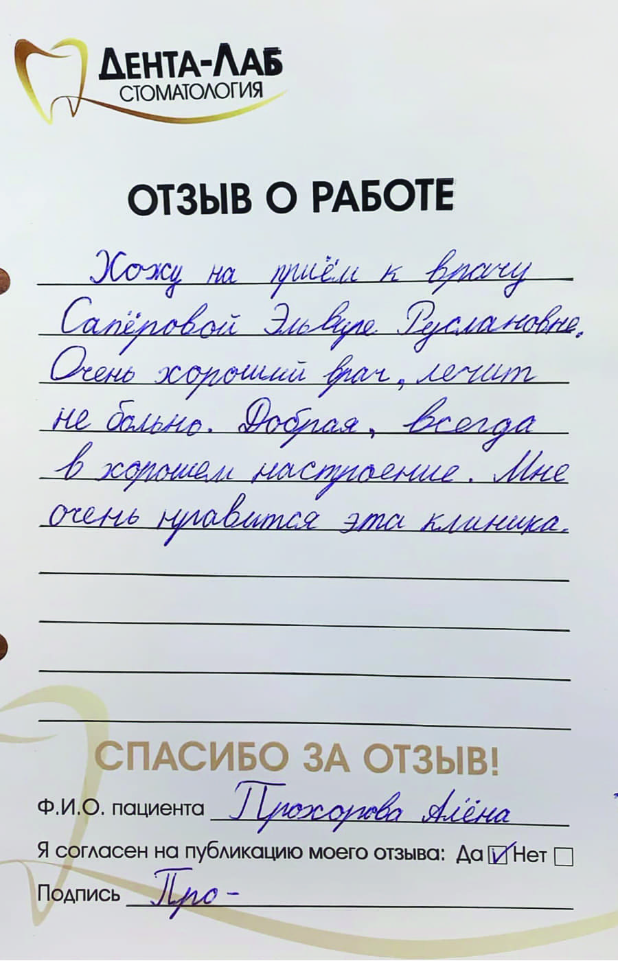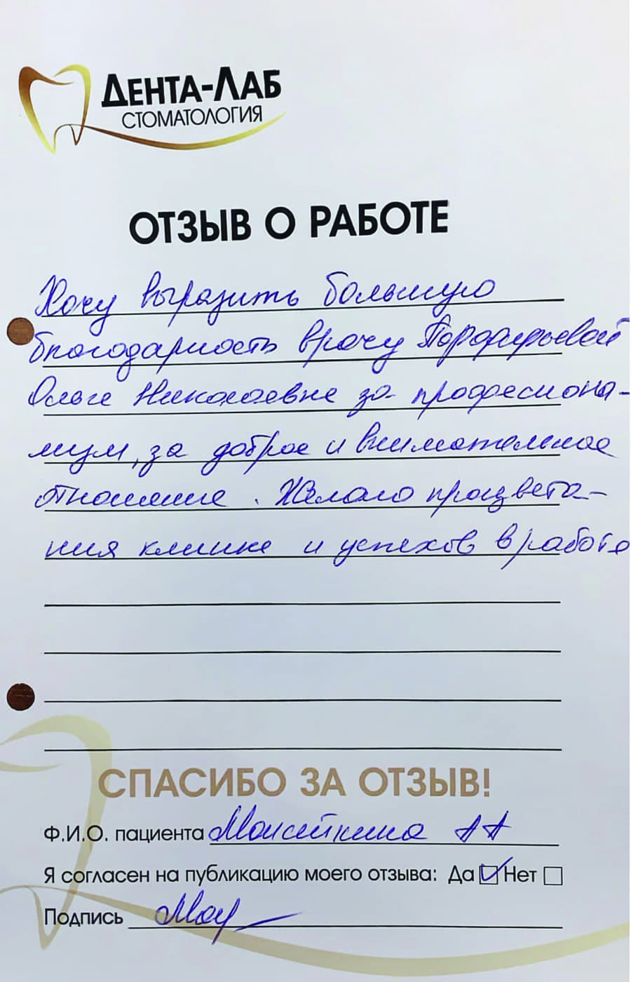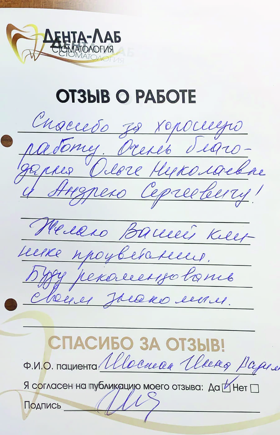 Остались только положительные эмоции после посещения клиники ДентаЛаб.Всегда приятная атмосфера,чисто,красиво и уютно.Отдельное спасибо доктору Оксане Михайловне... Даниил К. Отзывы Яндекс