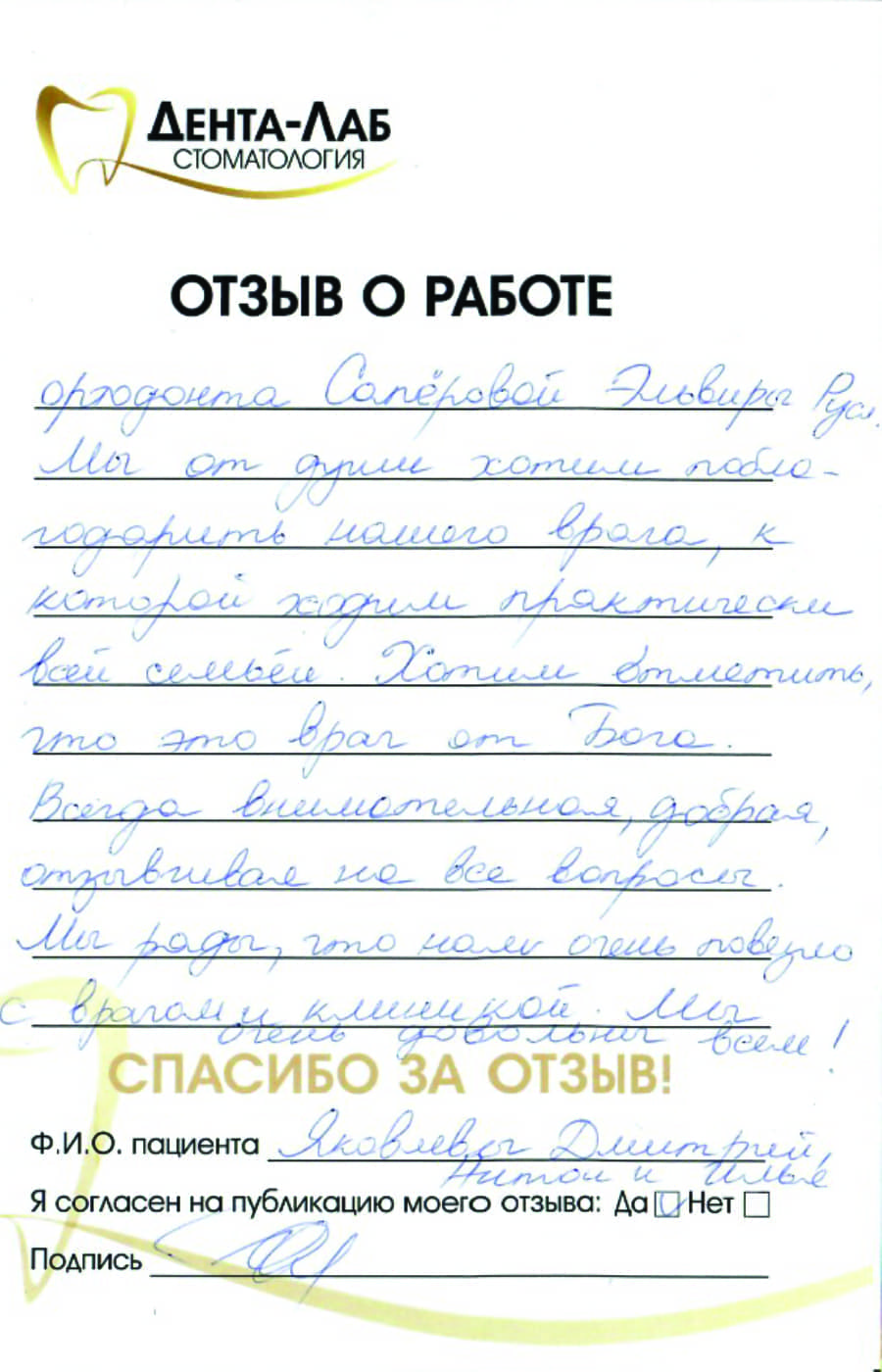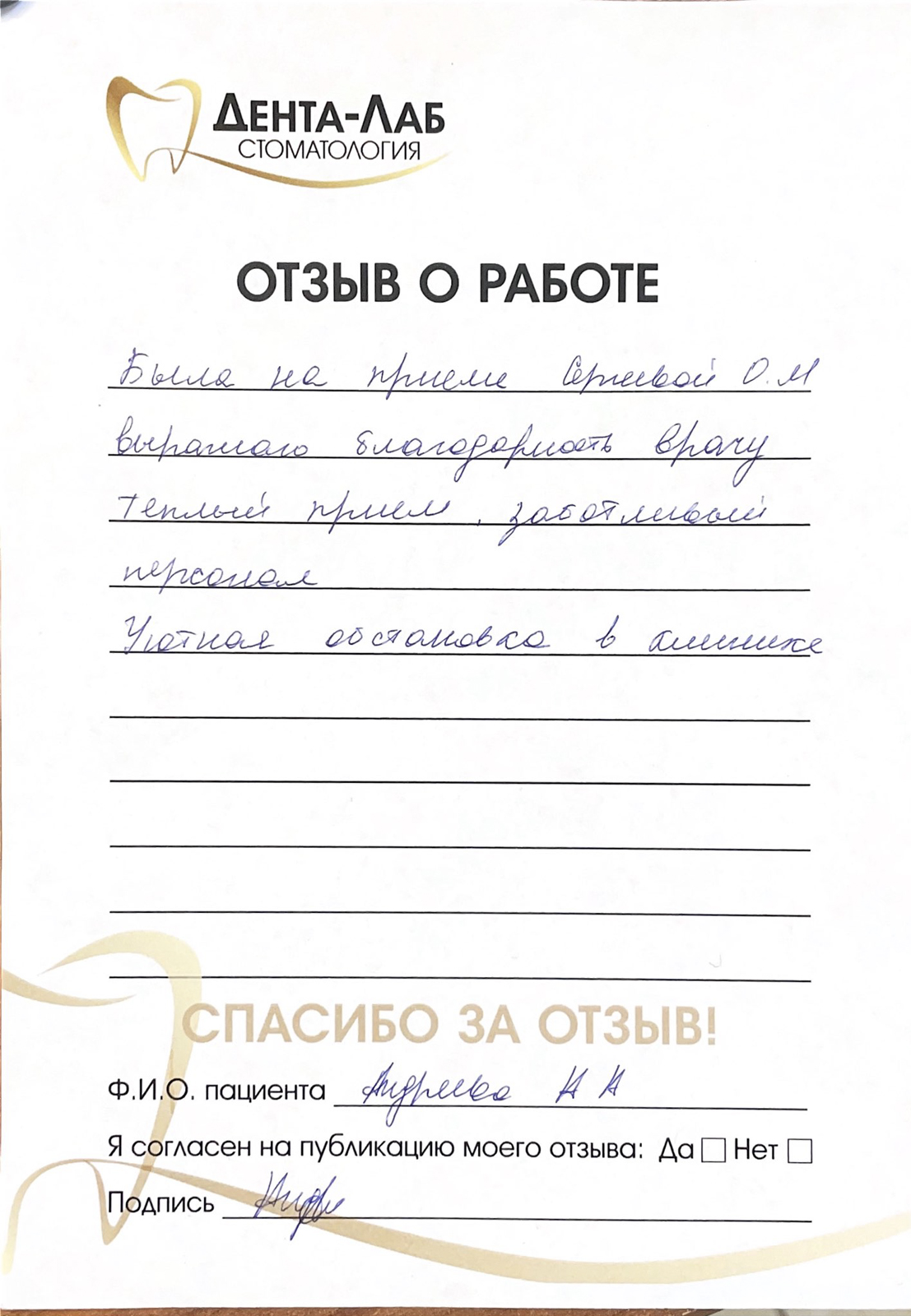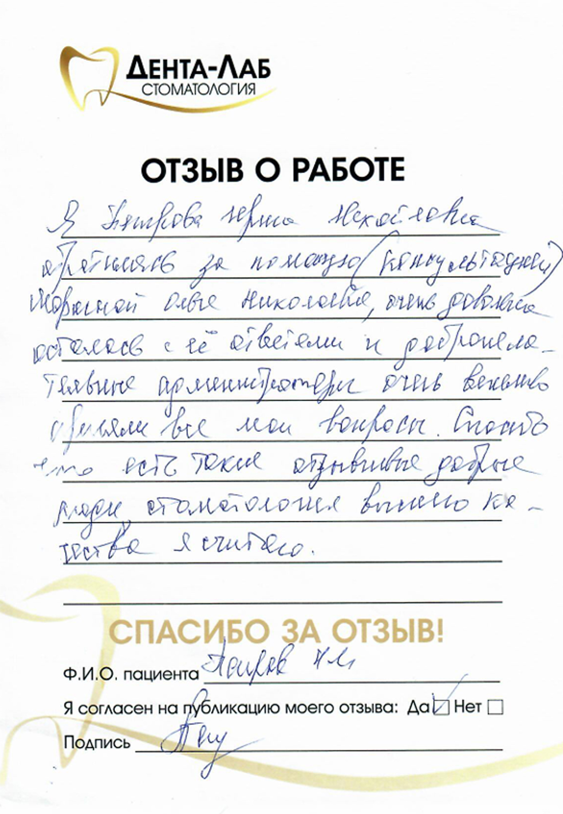 Остались только положительные эмоции после посещения клиники ДентаЛаб.Всегда приятная атмосфера,чисто,красиво и уютно.Отдельное спасибо доктору Оксане Михайловне... Даниил К. Отзывы Яндекс