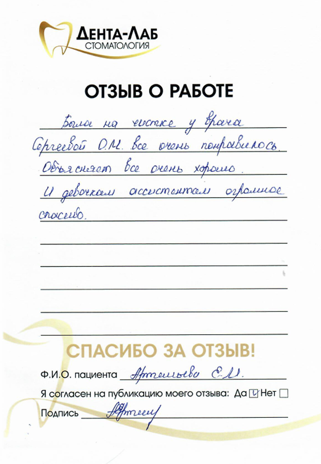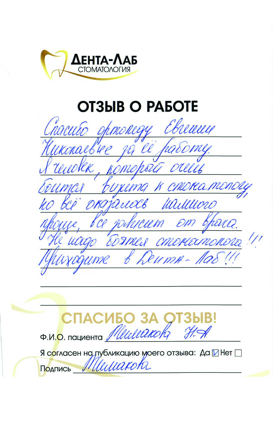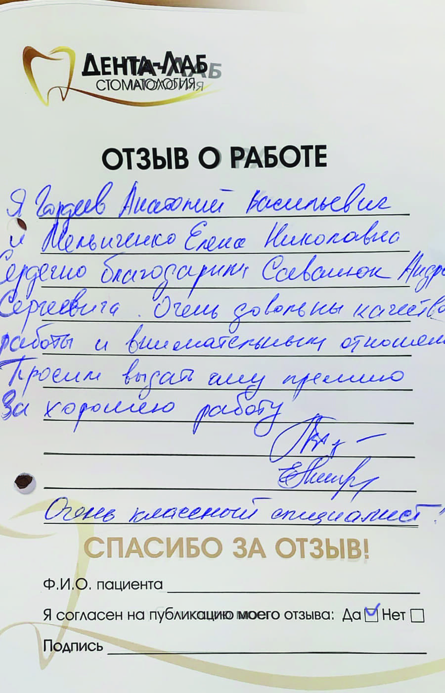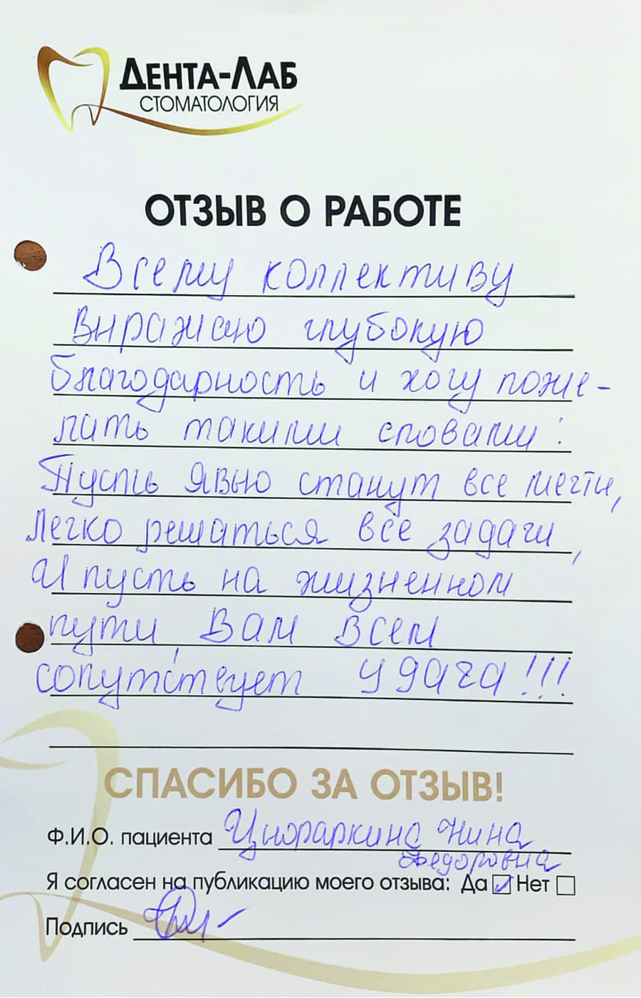 Остались только положительные эмоции после посещения клиники ДентаЛаб.Всегда приятная атмосфера,чисто,красиво и уютно.Отдельное спасибо доктору Оксане Михайловне... Даниил К. Отзывы Яндекс
