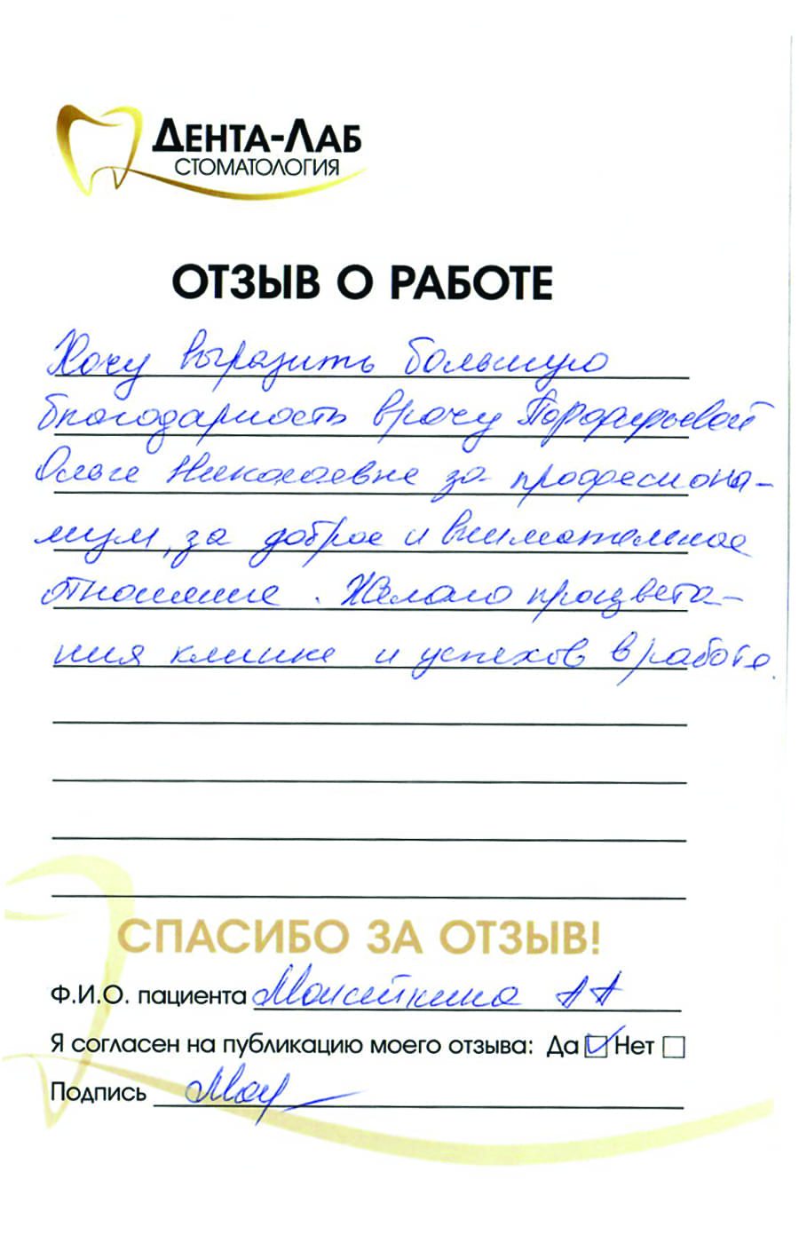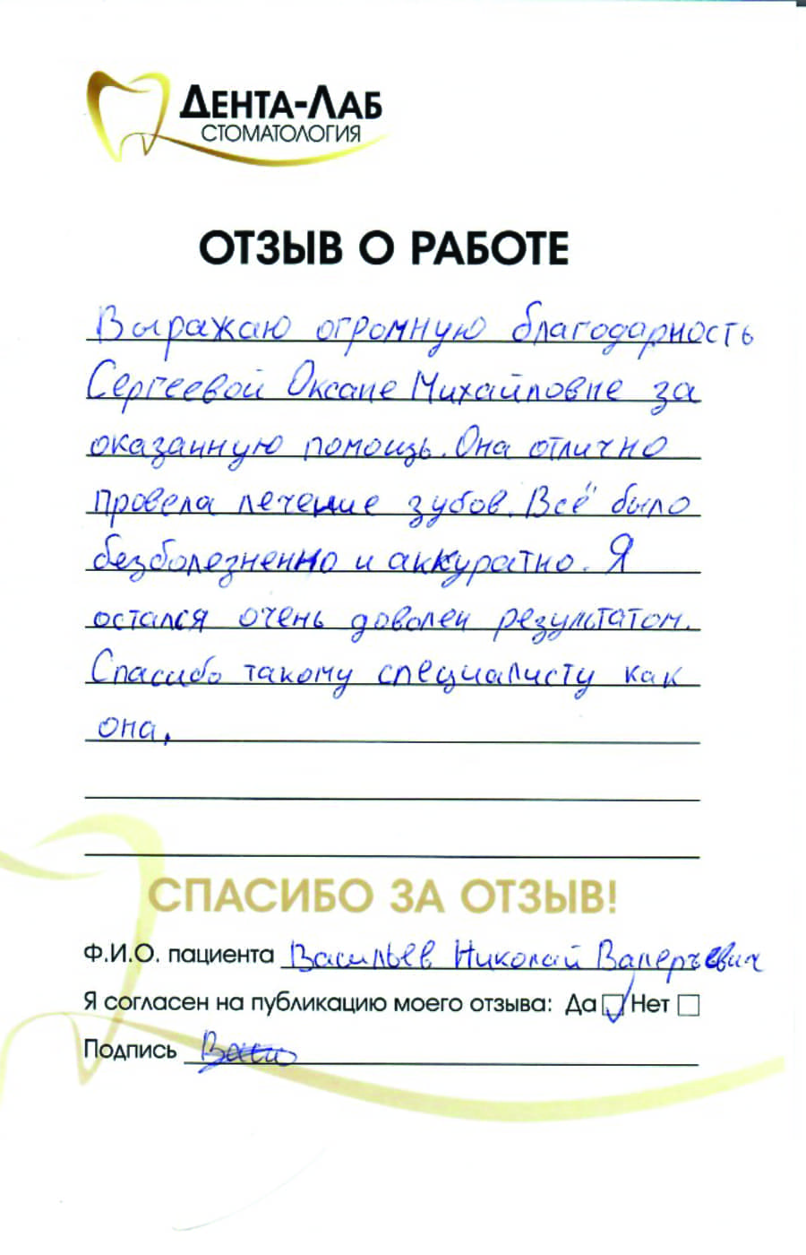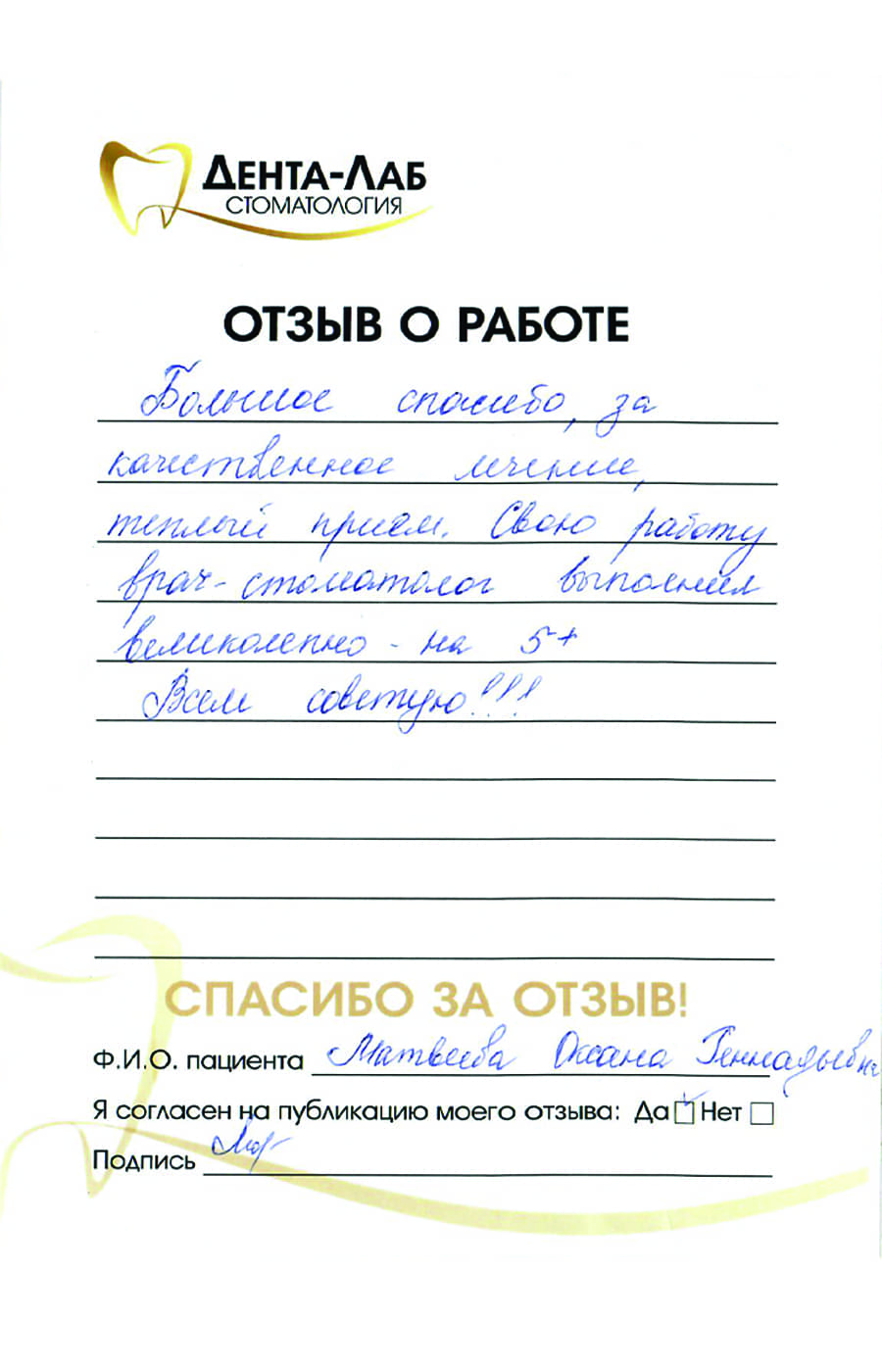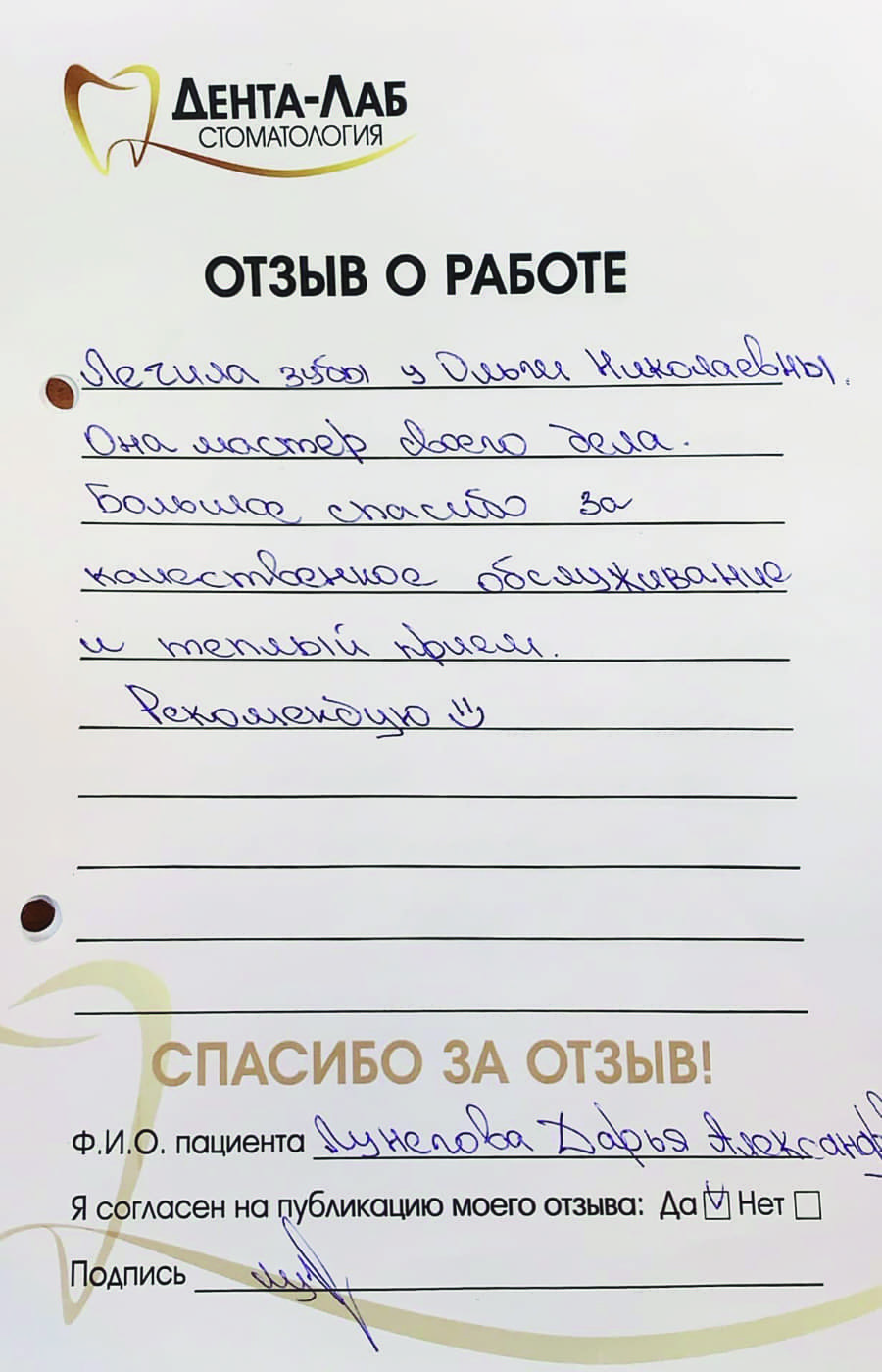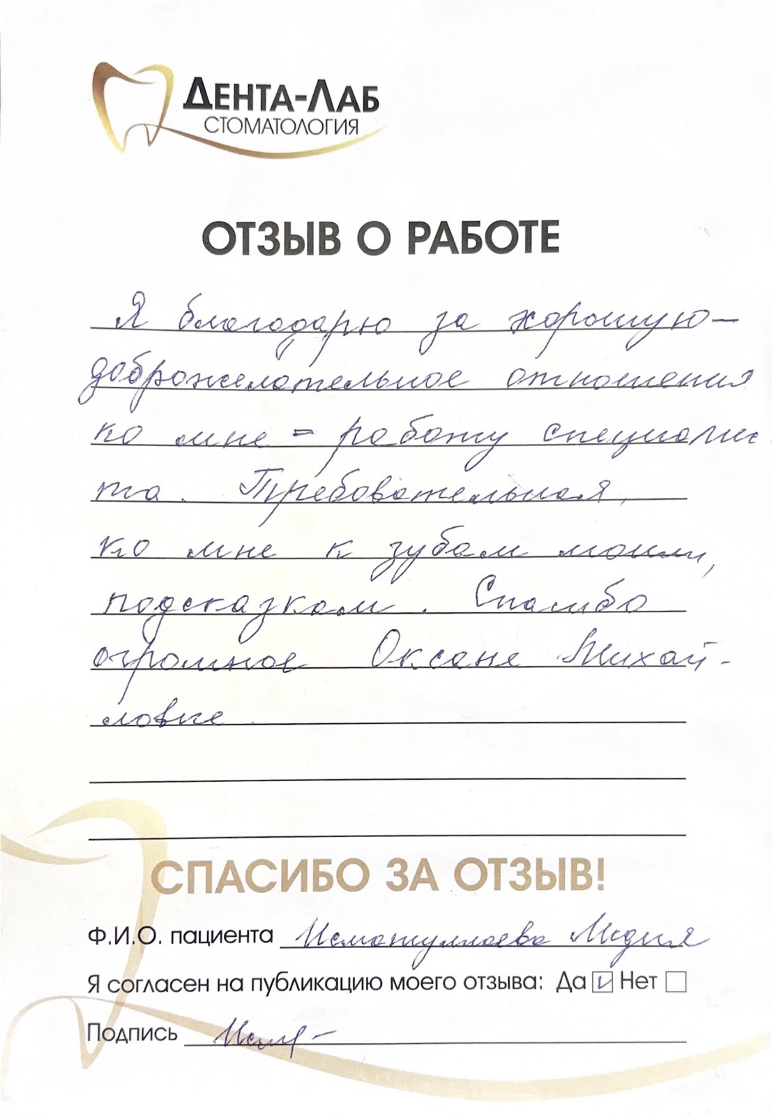 Благодарю врача Оксану Михайловну за красивуб пломбу и полное отсутсвие боли. Я даже чуть не уснул пока дедали процедуру. Так все было аккуратно и спокойно... Игорь Ф. Отзывы Яндекс